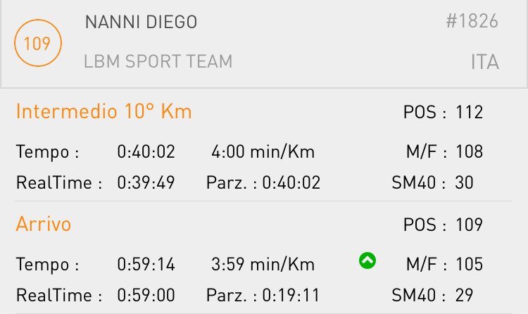 Passo al rilevamento dei 10k sotto i 40, in perfetta tabella di marcia. Come detto, gli ultimi 4 chilometri percorsi lungo stradoni dritti aiutano a tenere il ritmo costante e l'ultima parte in leggera discesa permette anche di accelerare. Alla fine taglio il traguardo con un ottimo 59'00" di real time (59'14" gun time) che mi soddisfa pienamente, considerando il fatto che sono nella fase clou della preparazione e i carichi si fanno sentire.