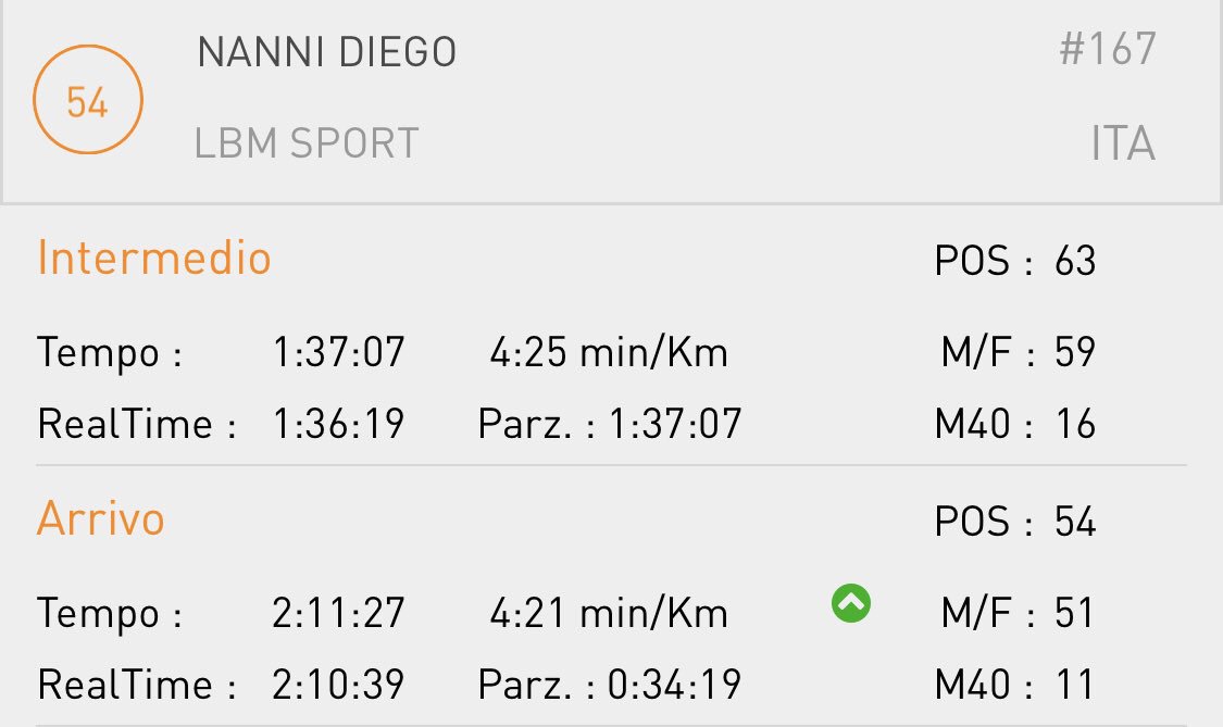 Chiudo col tempo ufficiale di 2 ore 10 minuti e 39 secondi col passo medio di 4'22"/Km che rappresenta il mio nuovo personale sulla distanza (anche se il Garmin mi segna poco più di 300 metri in meno). In classifica sono 54° assoluto su 488 partecipanti e 11° di categoria (su 86). Sono soddisfatto soprattutto per la condizione fisica che sento in crescendo e che mi permette di guardare con fiducia al proseguo della preparazione autunnale.